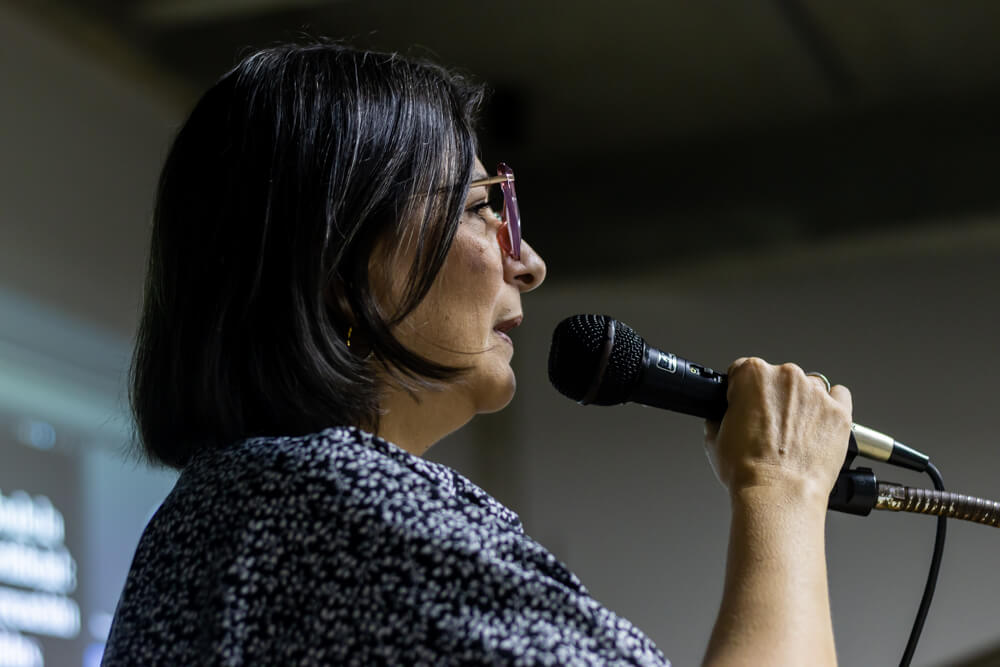 La profesora Ángela Girola Ercolino fue la moderadora de las diferentes ponencias que ofrecieron los invitados y las preguntas e ideas que los estudiantes aportaron durante cada una.